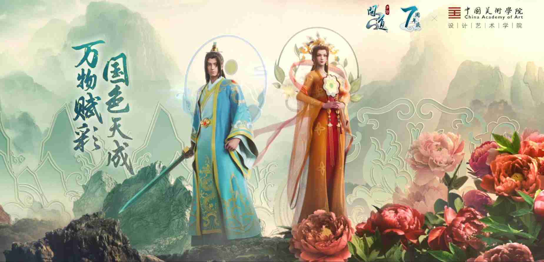 2023年4月,,,,《问道手游》联动中国美术学院,,,,在游戏中融合了中国历史上不同时期的文化元素,,,,打造了“山河万象”与“凤鸣九霄”的国风时装。。在色彩配置方面,,,,创作团队基于对游戏角色特性的分析提取相应的文化内涵,,,从每一种色彩的色相、、、、指代事物和情感出发对应角色属性,,,选定服装的色彩搭配。。。。在纹样设计方面,,,创作团队结合游戏角色自身特殊的造型比例和形态,,,,在实际的纹样设计中进行了游戏语境下的活化演绎。。。男性角色集中使用了如蟒纹、、、海水江崖纹、、、、如意纹和云气纹等传统纹样元素,,,,女性角色则吸纳了凤凰纹、、、、牡丹纹、、、卷草缠枝纹等元素,,组成以“双凤牡丹纹样”“缠枝牡丹纹”“金玉凤冠头饰”为主要纹样的游戏角色装饰图案系统。。