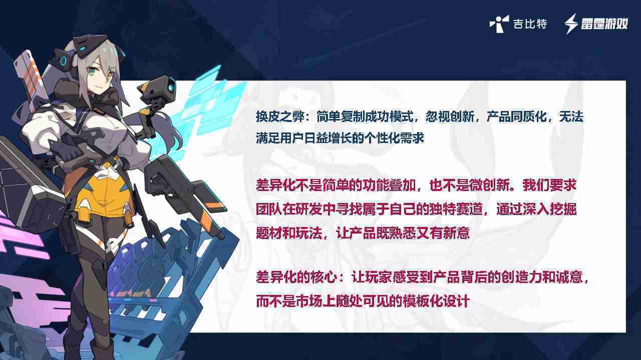 在我们内部是这么定义差异化的。。。。首先,,,,差异化不是简单的功能叠加,,,更不是换皮。。只是换皮,,产品无法提供有效的市场价值。。。内部经常说差异化的产品不是为了迎合市场,,而是找到一个自己独特的表达方式,,在研发中找到属于自己的细分赛道和独特赛道,,,,前提是需要对这个题材有足够的深入、、、挖掘,,,对玩法有足够深入的理解,,让产品看起来既熟悉又有新意。。
