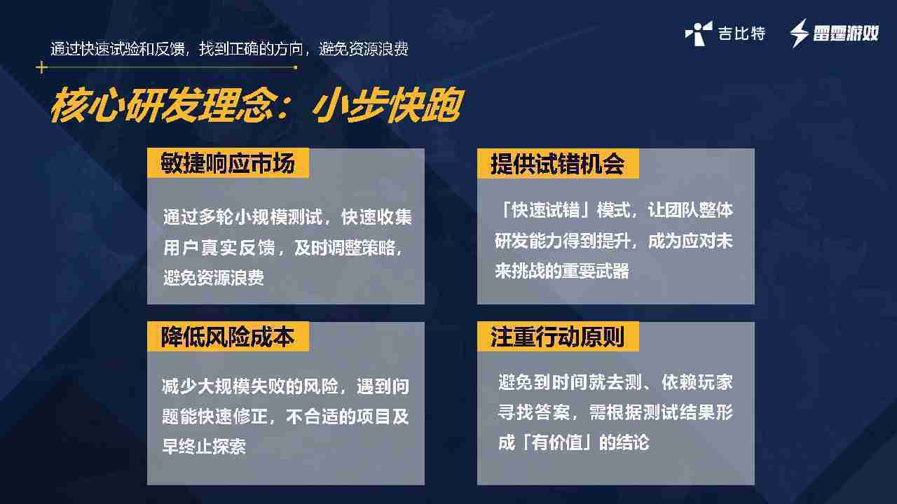 小步快跑不是找答案,,而是验证答案。。。。我们之前有项目是这样的,,有些制作人会有几个方向觉得都可以做,,但是不确定做哪一个,,,,会选择几个都做,,,做完拿到市场跑,,,跑出哪一个更好,,,,基于这个再做后续的研发和拓展。。。但这种情况最容易出现一个问题,,,,可能被玩家裹胁,,,,玩家说这个点不错、、、、那个点不错,,到底听还是不听,,,,不听感觉是无视玩家的反馈,,,,听的话,,可能自己没想清楚导致研发思路发生偏颇。。。所以针对这一点后面自己复盘整理,,,发现制作人自己心里要有数,,要做自己觉得好玩的,,,而且明确知道这个东西是你想做的,,然后拿到市场验证这个答案是不是对的,,,而不是拿一堆答案找哪一个答案更好。。。