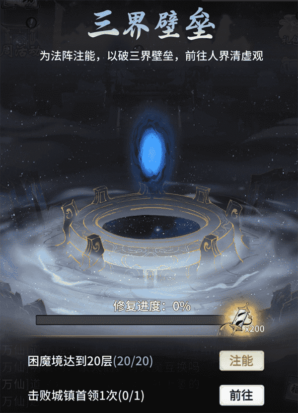 当你修为达到返虚/破虚中期后,,,可在城镇寻得芸丫并激活神秘法阵,,,,通过收集材料、、、击败首领等方式为法阵注能,,借以打破三界壁垒,,开启支线剧情“清虚旧梦”