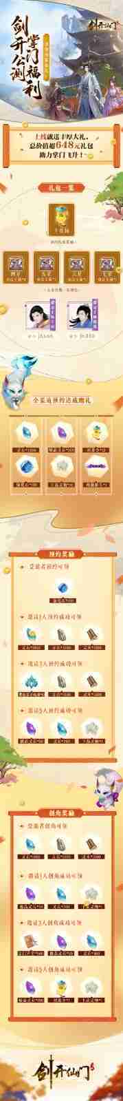 游戏为大家准备了海量的福利,,,,包括上线即可获得的全渠道预约礼包、、、、十连抽等福利,,,,输入密令“JK666”、、、、“JK888”即可领取紫色弟子,,达到金丹期后还有功法宝箱可领,,,助力全宗上下实力提升……所有奖励总价值超过648元,,,而邀请好友一起体验,,,,更可以获得额外的奖励哦~